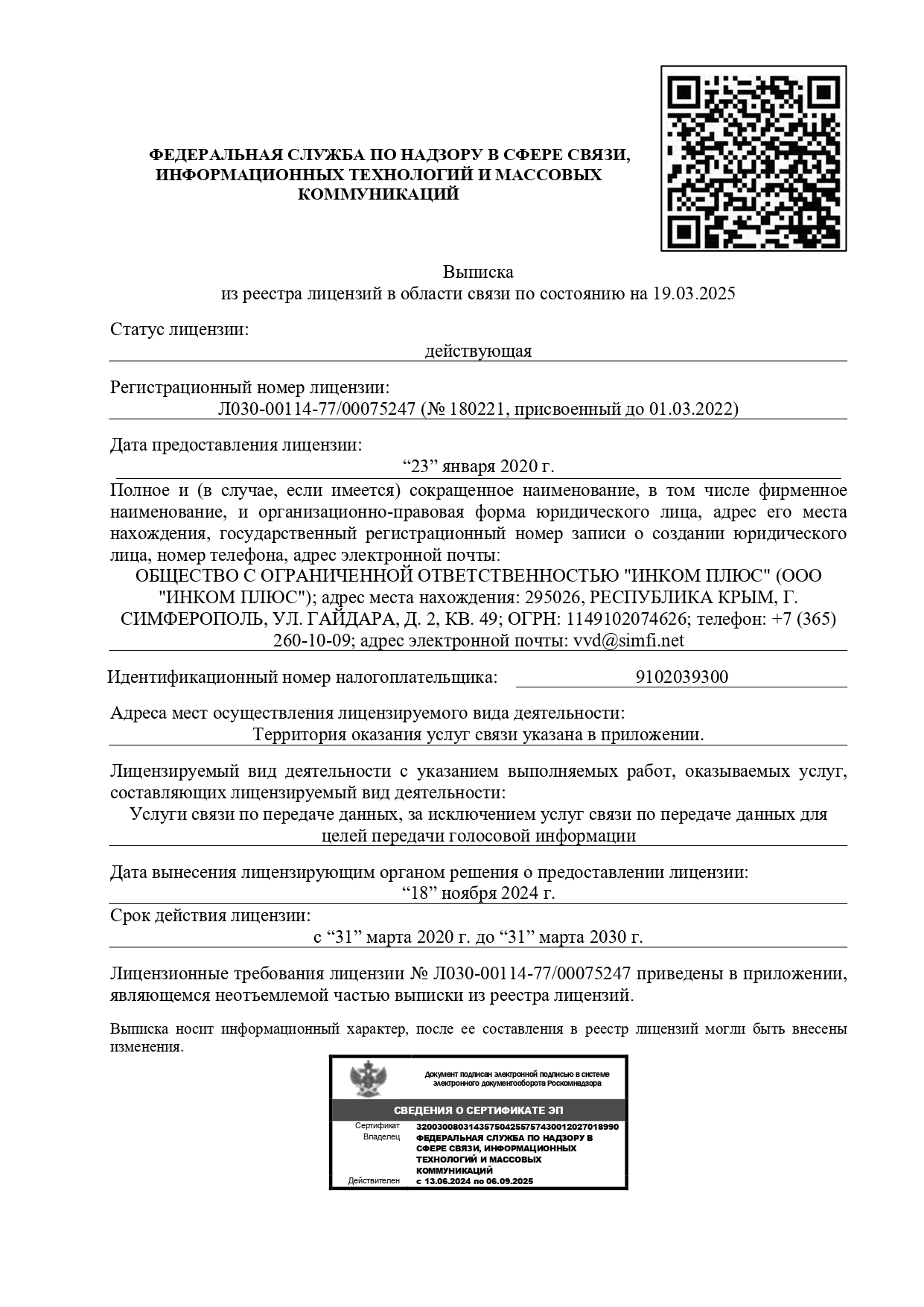 Лицензия Л030-00114-77/00075247 (№ 180221, присвоенный до 01.03.2022) с “31” марта 2020 г. до “31” марта 2030 г.